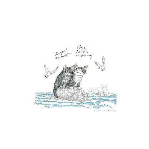 世界中の地域猫が幸せに暮らせるように願いを込めて描きました。実はこの絵の中にいろいろな国の「ねこ」という言葉が隠れています。探してみてね!