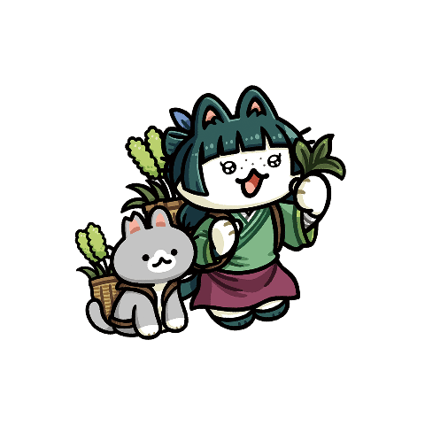 今回のチャリティーのために描きおこされた、"猫化"した猫猫(マオマオ)。地域猫さんが薬草採取をお手伝いしています。