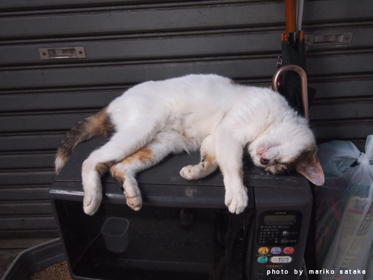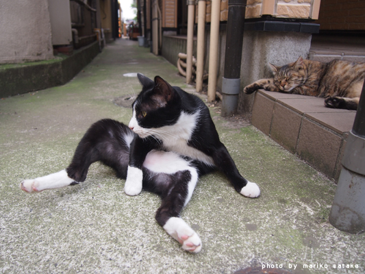 八百屋さんわきの路地で、くつろいでいるのは、黒白のクロちゃん。2年前に迷い込んできたチビの時は、警戒心いっぱいでしたが、立派な青年になって、とてもフレンドリー。可愛がられて、居心地がいいのでしょうね。向こうで熟睡しているのはオカアチャン(クロの母さんではありません)です。