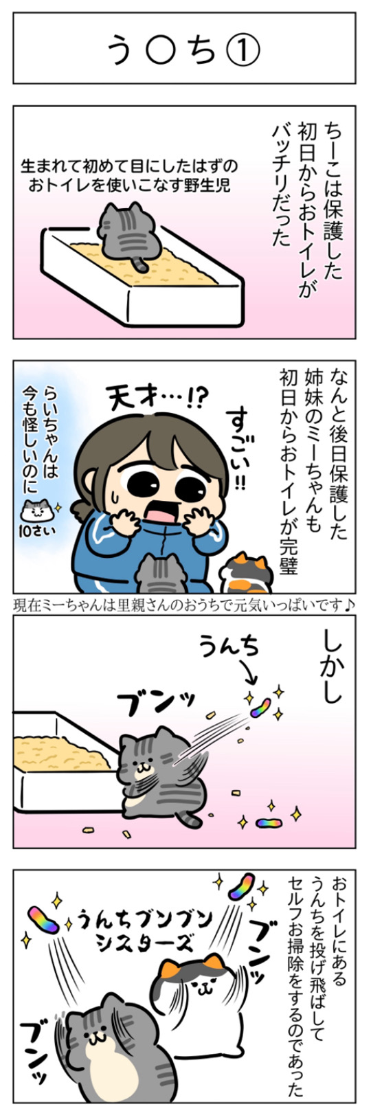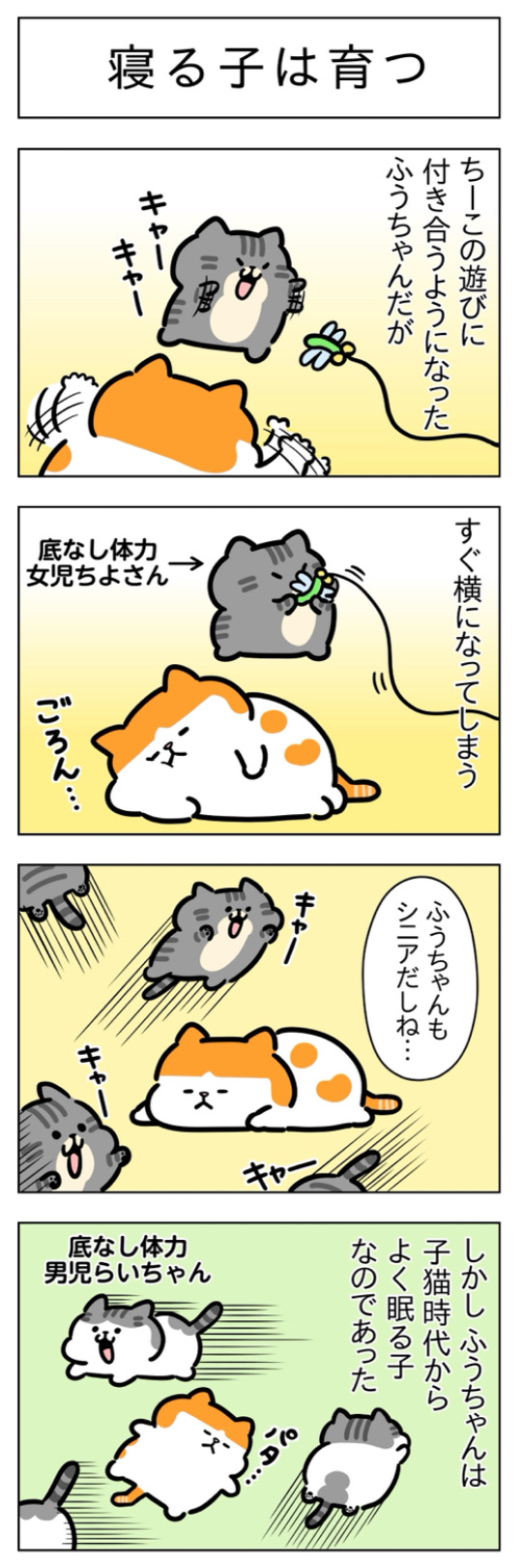 2番目にうちの子になった猫は赤ちゃんで来たので猫の世界の事が分からなかったのですが、最初にうちの子になった猫が猫の世界の事を教えてくれたので、噛む時も甘噛みで、爪を出さずに猫パンチをしてました。梅ちゃんはちーこちゃんが猫生を安心して過ごせる様に一生懸命教えてたんだと思いました。梅ちゃんの優しさが伝わってきます。